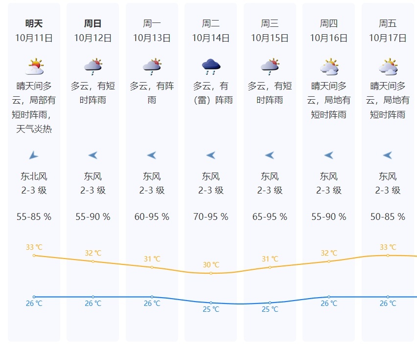 •10月11日晴天间多云,局部有短时阵雨,天气炎热;