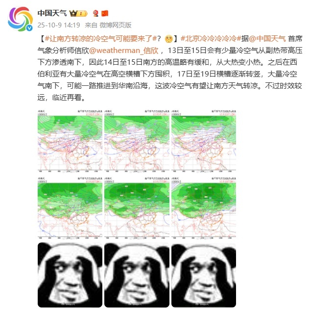 中国天气网首席气象分析师信欣分析,10月13日至15日会有少量冷空气从副热带高压下方渗透南下,因此10月14日至15日南方的高温略有缓和,从大热变小热。之后在西伯利亚有大量冷空气在高空横槽下方囤积,10月17日至19日横槽逐渐转竖,大量冷空气南下,可能一路推进到华南沿海,这波冷空气有望让南方天气转凉。