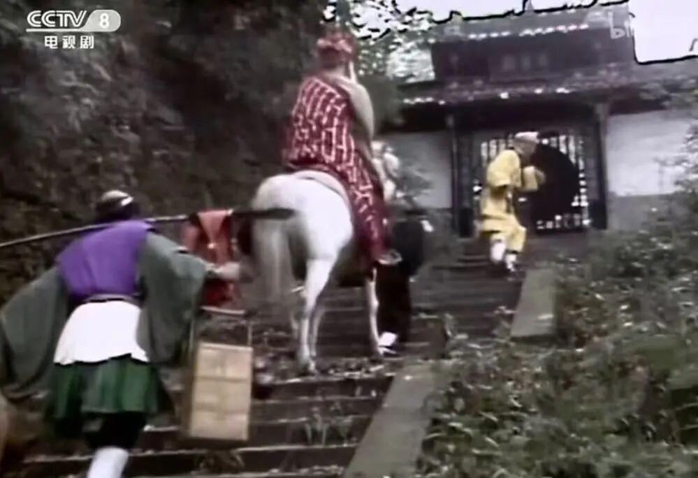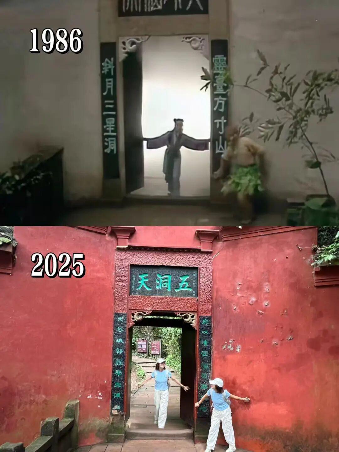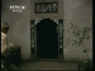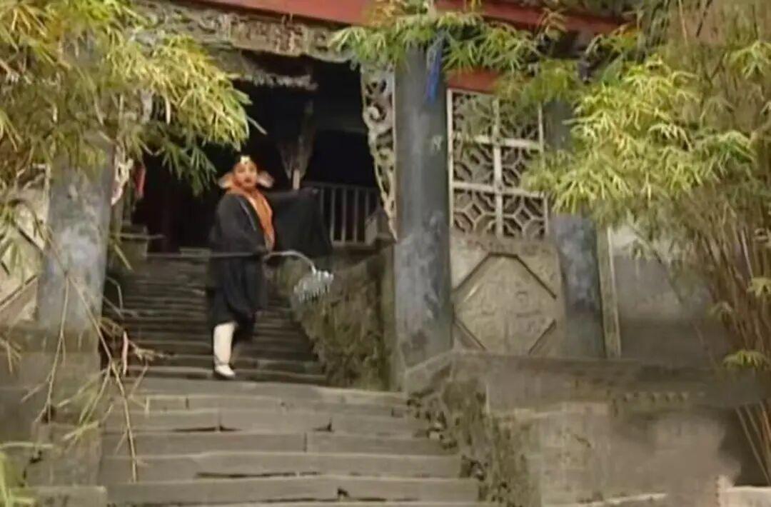 “灵台方寸山、斜月三星洞”的山门,就是青城山的“五洞天”,孙悟空穿着“草裙”,敲了敲门,又猴里猴气的躲到门旁边。