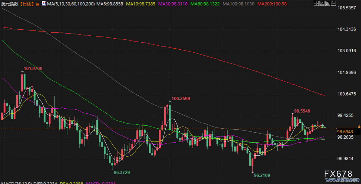 美元指数尾盘下跌 0.11%,报 98.84;欧元上涨 0.15%,报 1.1643 美元。